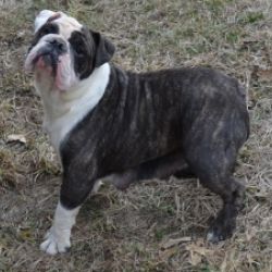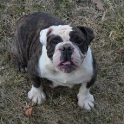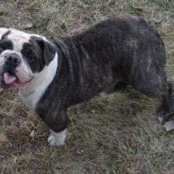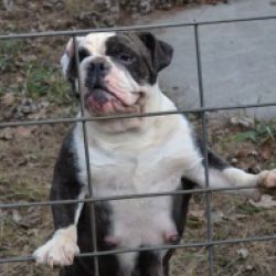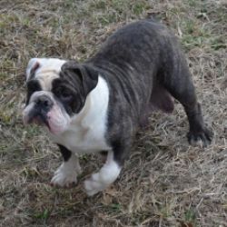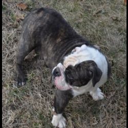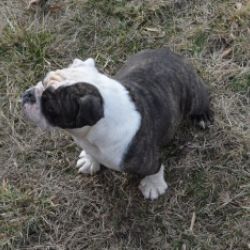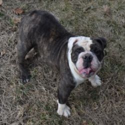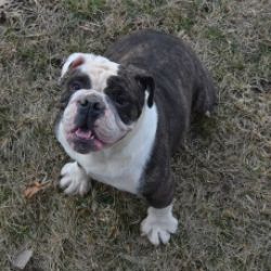 Mia has a friendly, outgoing personality. She is active and likes to play. Her dark brindle coat contrasts nicely with her white markings.